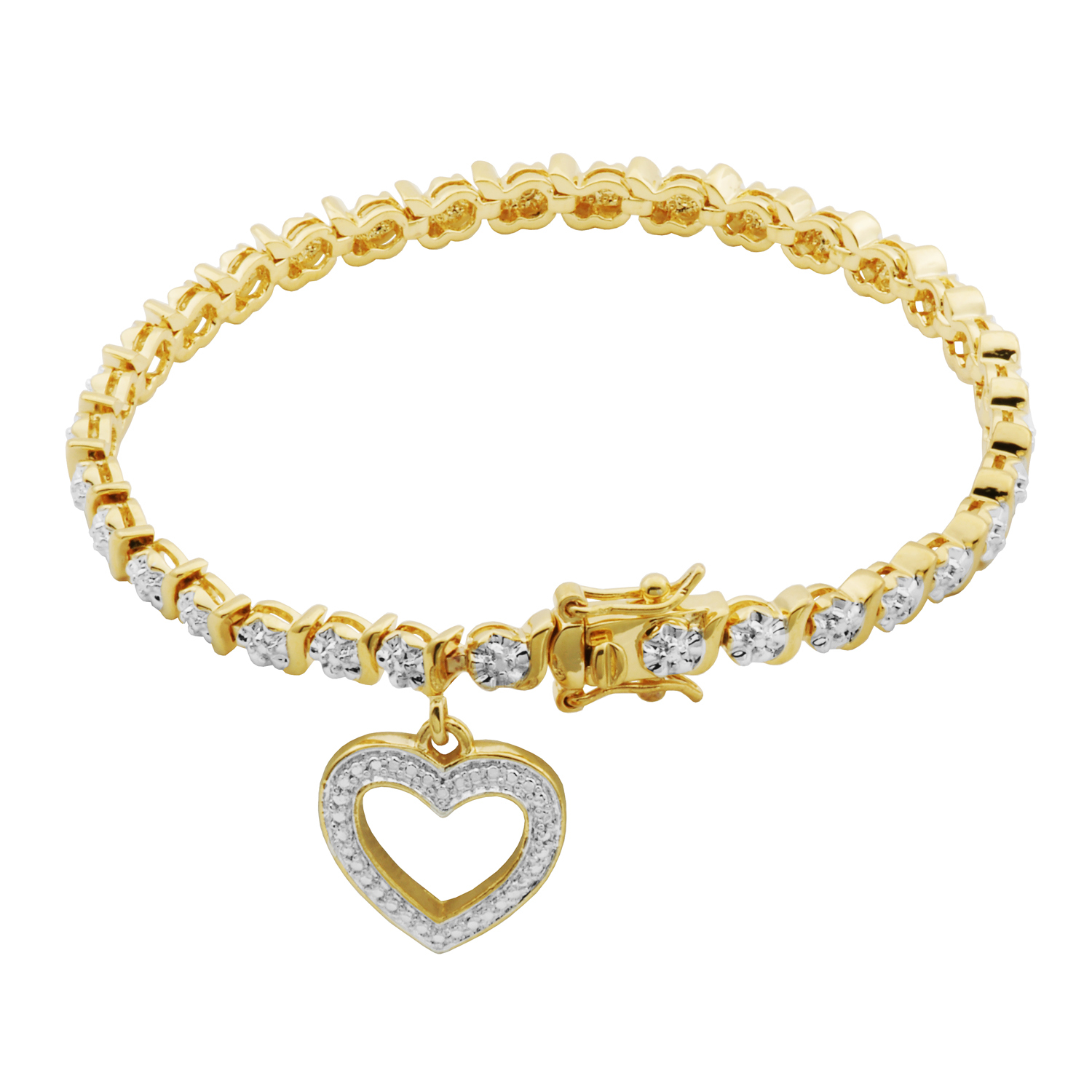 This stunning 18K yellow gold plated tennis bracelet features a diamond accent open heart charm that is sure to attract the eyes of many. Wear this item with pride because the high-quality craftsmanship and the charming detail will be key conversation pieces. This 7-1/4" bracelet makes a meaningful, loving gift idea for birthdays, holidays, Mother’s Day, Valentine’s Day, for bridesmaids or for any special occasions.18K Yellow Gold plate Bronze bracelet featuring open heart charm with double hinged safety clasp 7.25-inch total length Nickel-free and hypoallergenic, hand-crafted; 18K Yellow Gold plating added to enhance shine, durability and tarnish-free shine Perfect for the sophisticated, fashion-minded lady in your life, be it your mom, sister, daughter, aunt, grandmother, best friend – or even yourself! Do you have an important date or anniversary coming up? Celebrate it in style! This makes a meaningful, loving gift idea for Christmas, birthdays, Mother’s Day, Valentine’s Day, or any special occasion that calls for a unique look Please store your jewelry in a dark, cool, dry place and avoid rubbing plated items together to ensure the longevity of your plated statement bracelet. Also try to avoid exposure to cleaning products and perfume which can both negatively affect your bracelet