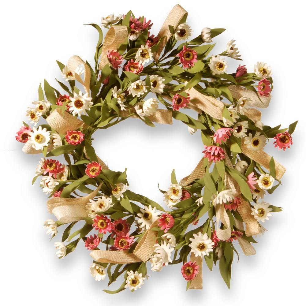 This wreath features blooms of white and pink sunflowers mixed with long leafy green stems. Beige burlap bows are blended into the design for an added rustic flavor. Display this unique decoration on doors, walls and windows in indoor or covered outdoor locations.