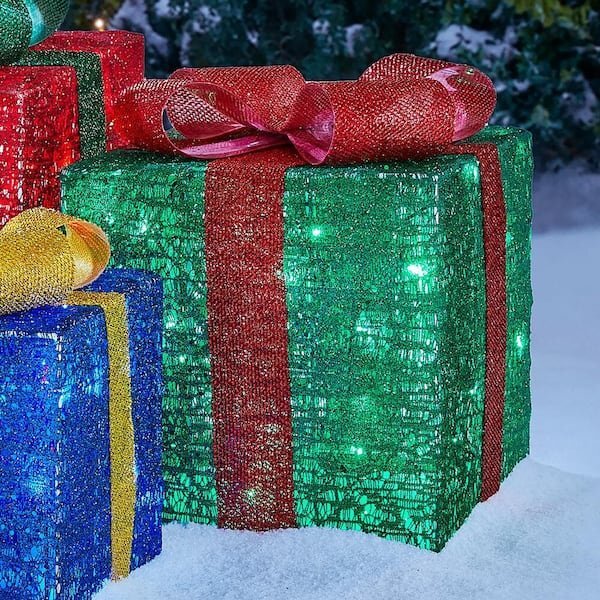 Put the perfect finishing touch on your outdoor holiday display with this set of three gift yard sculptures. Pretty presents in three different sizes let you create a custom scene, and the thoughtful sizing provides an ideal complement to trees, nutcrackers and other decorating essentials. Energy-efficient LEDs brighten your lawn for a merry look, while metal frames and weather-resistant fabric ensure lasting use. Featuring included ground stakes, these gift yard sculptures are easy to set up.