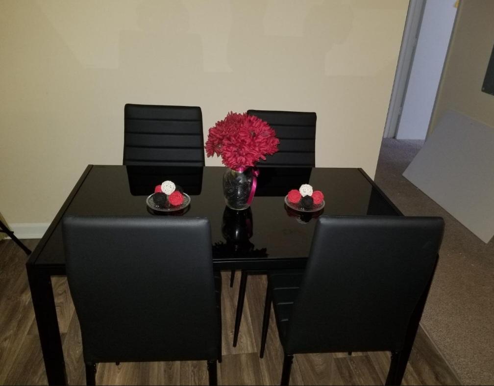 This 5 pieces dining set including one table and four chairs is ideal for home use with its modern, simple and practical design. The product is packed in two packages.