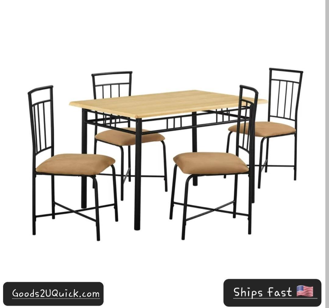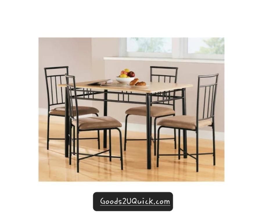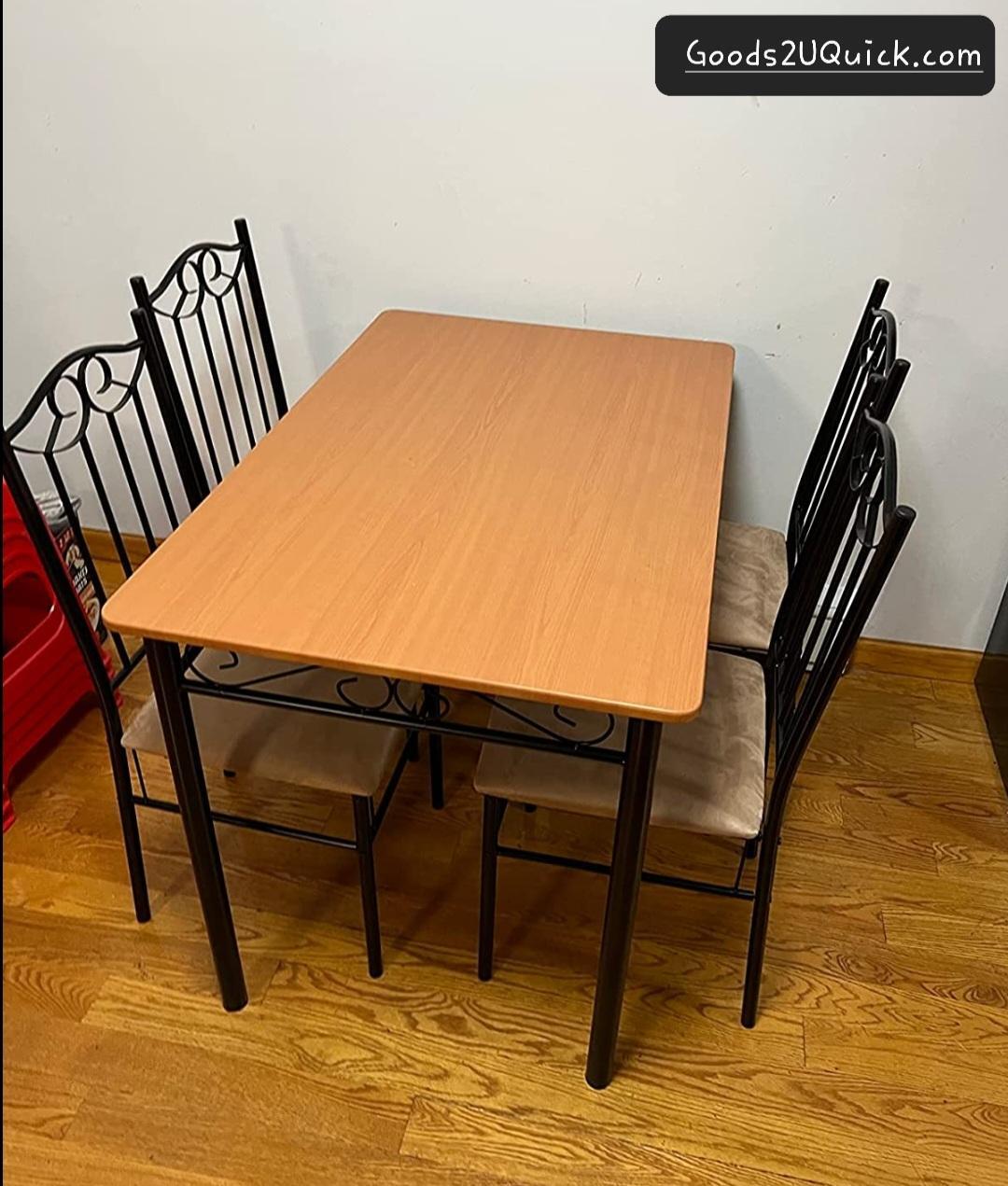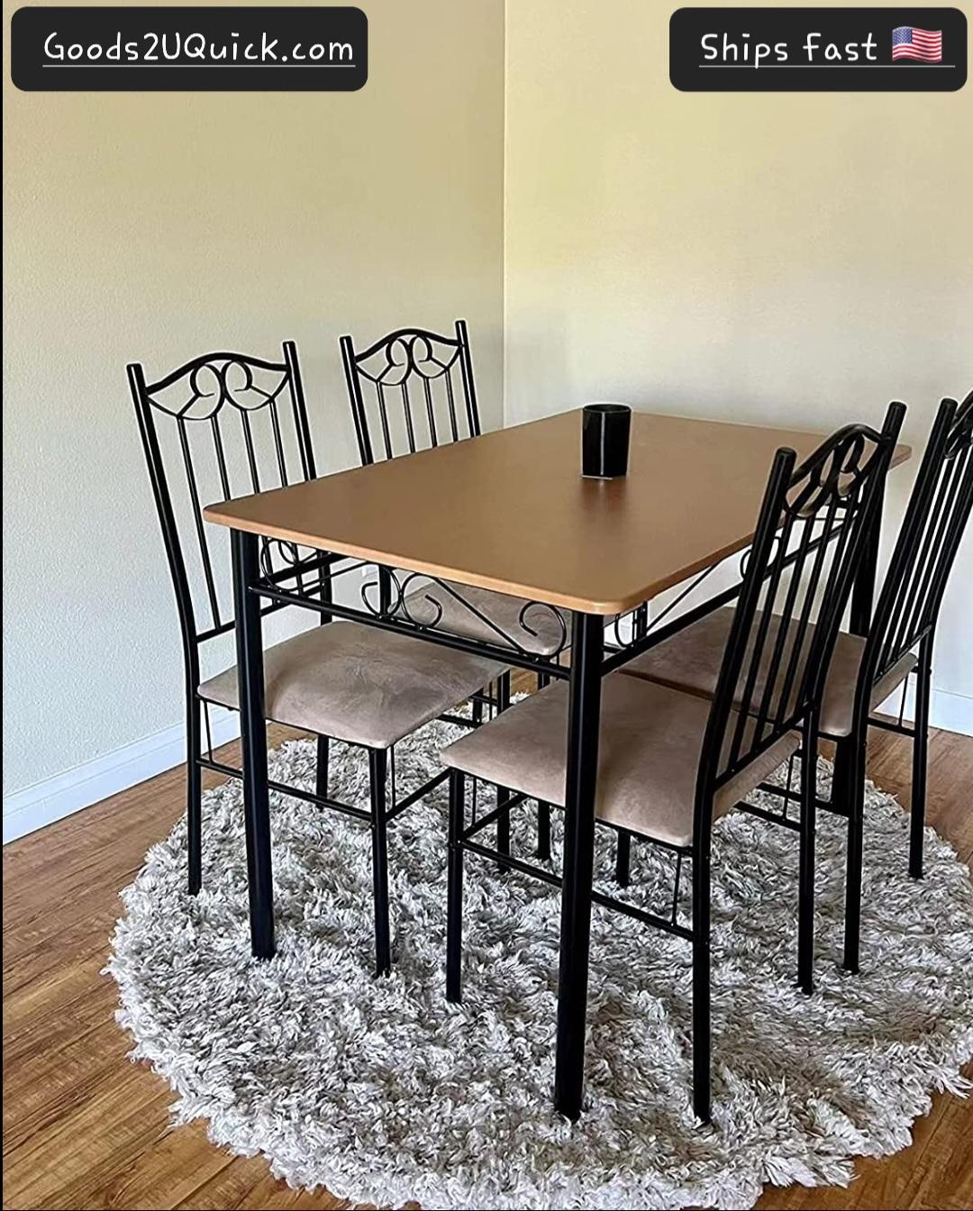 The compact and stylish dining set is great for small spaces and perfect for apartments, kitchens, or dorm rooms. This set consists of a sturdy metal table with an easy-to-clean wood top. The four metal chairs feature dark beige upholstered seats that tuck in neatly when not in use. The dining set will complement virtually any home decor and is a wonderful way to bring warmth and comfort into your kitchen or dining area.