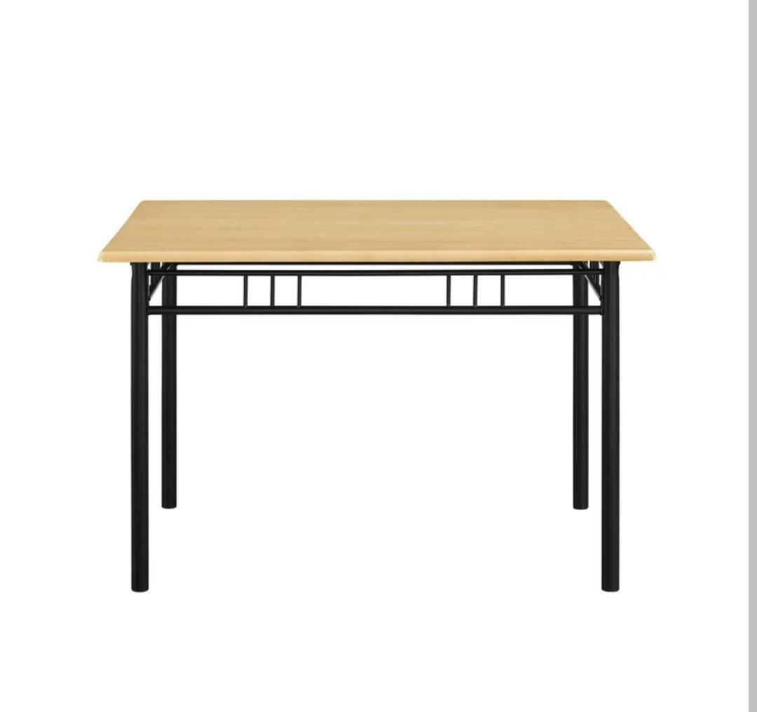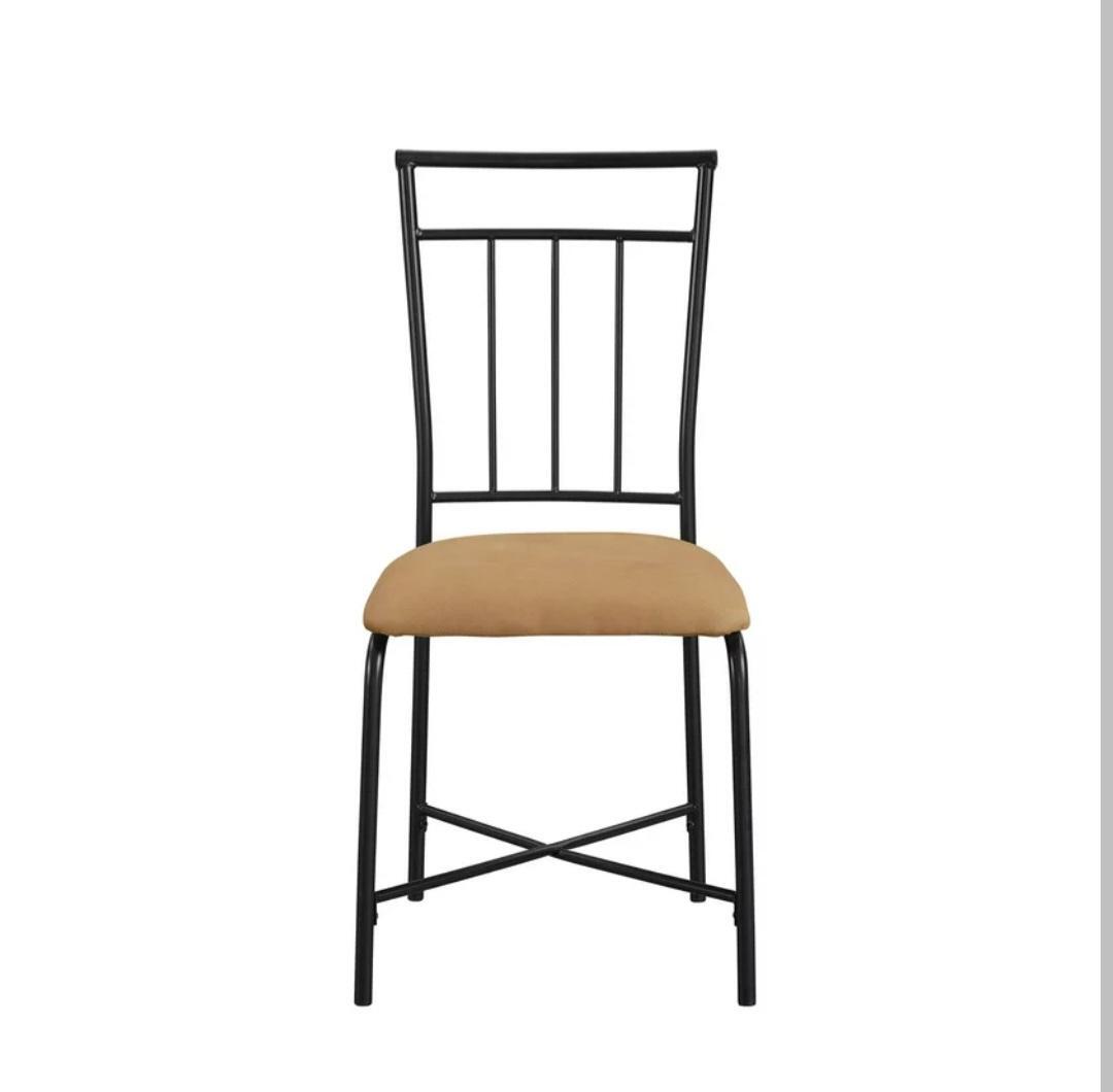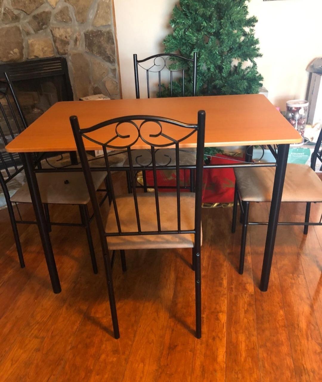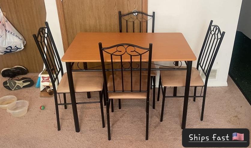 The compact and stylish dining set is great for small spaces and perfect for apartments, kitchens, or dorm rooms. This set consists of a sturdy metal table with an easy-to-clean wood top. The four metal chairs feature dark beige upholstered seats that tuck in neatly when not in use. The dining set will complement virtually any home decor and is a wonderful way to bring warmth and comfort into your kitchen or dining area.