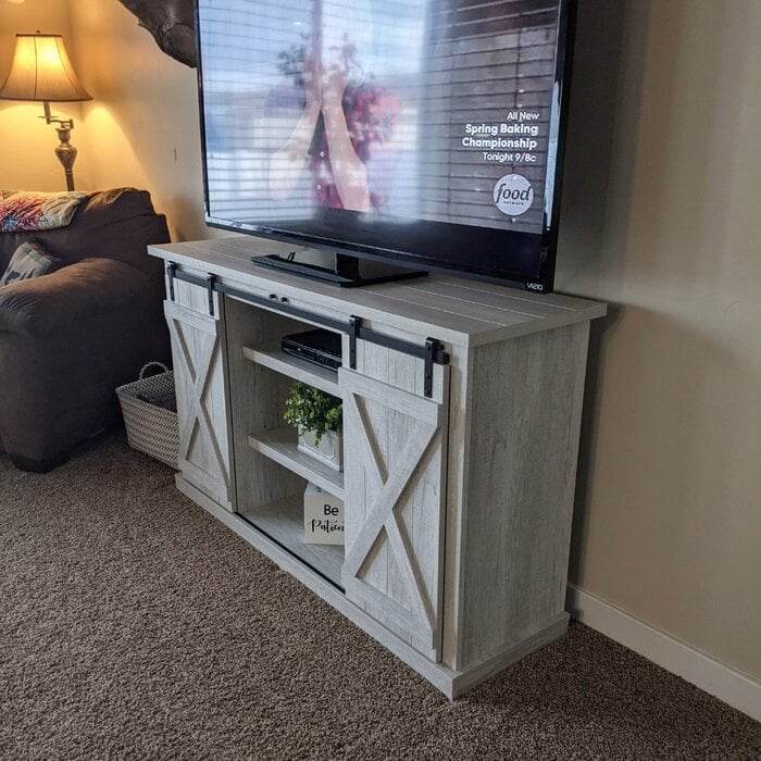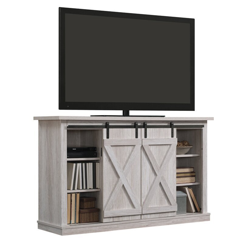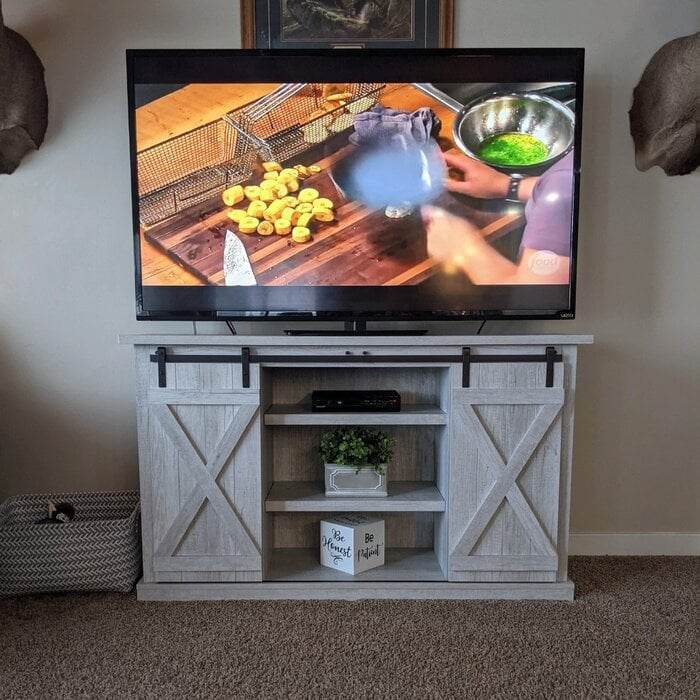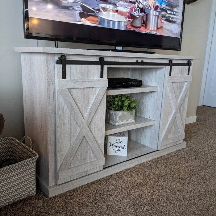 This TV stand has a charming, rustic aesthetic and provides your space with plenty of room. The frame is built from engineered wood. Each of the two cabinets opens to store media players, games, books, and other equipment, while the three open shelves give you a place to display your favorite decorative objects. We love how the barn doors add a farmhouse feel to your living room. Sliding doors and black hardware complete the country look. Plus, a cable management cutout on the back keeps your cords corralled.