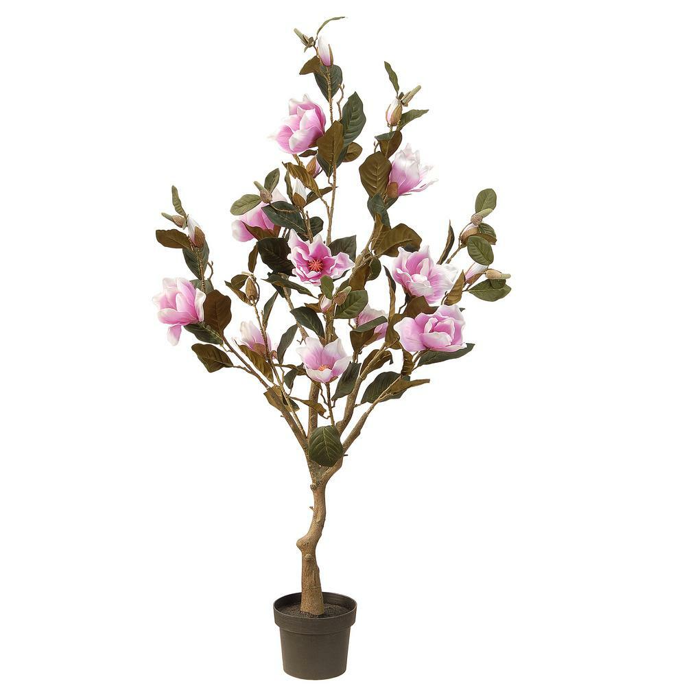 This potted plant features bright blooms of pink magnolia flowers atop long flowing branch stems. Mixed in are green leaves along with unopened flower buds for added natural appeal. It is seated in a weighted round growers pot base with matte black finish. This artificial plant appears to be living yet requires no maintenance, water or sunlight. Can be displayed in indoor or covered outdoor locations.