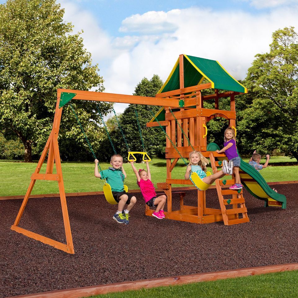 Provide kids with a fun way to get physical activity and exercise with this Backyard Discovery Tucson Cedar Wooden Swing Set. The frame is constructed eco-friendly, sustainable cedar wood that is factory-stained with a rich color that adds to its visual appeal. This Backyard Discovery Tucson swing set features a covered play deck, an 8' slide, two belt-swings with kid-friendly chains and an incredibly fun trapeze acrobat bar. A sand box and a picnic/activity table with a bench are also attached for kids who want to rest, eat or play games. Additional features include a step ladder/rock wall that provides easy access to the top floor. Loads of fun for girls and boys, this Backyard Discovery swing set comes pre-drilled, pre-cut, pre-stained and stamped lumber for easy two-adult assembly.
