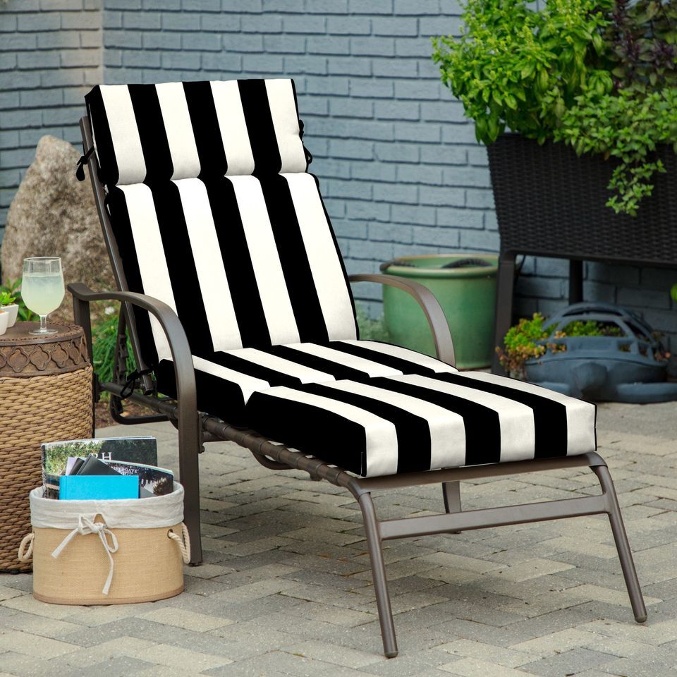 Create your own backyard escape with the Better Homes and Gardens Black and White Stripe Outdoor Chaise Lounge Cushion with Enviroguard. This cushion includes 4 sets of perfectly placed ties to keep it locked in place, so your space always looks perfectly pulled together. This cushion measures 21 in. wide x 72 in. in x 4 in. high making it the perfect size for a chaise lounger.