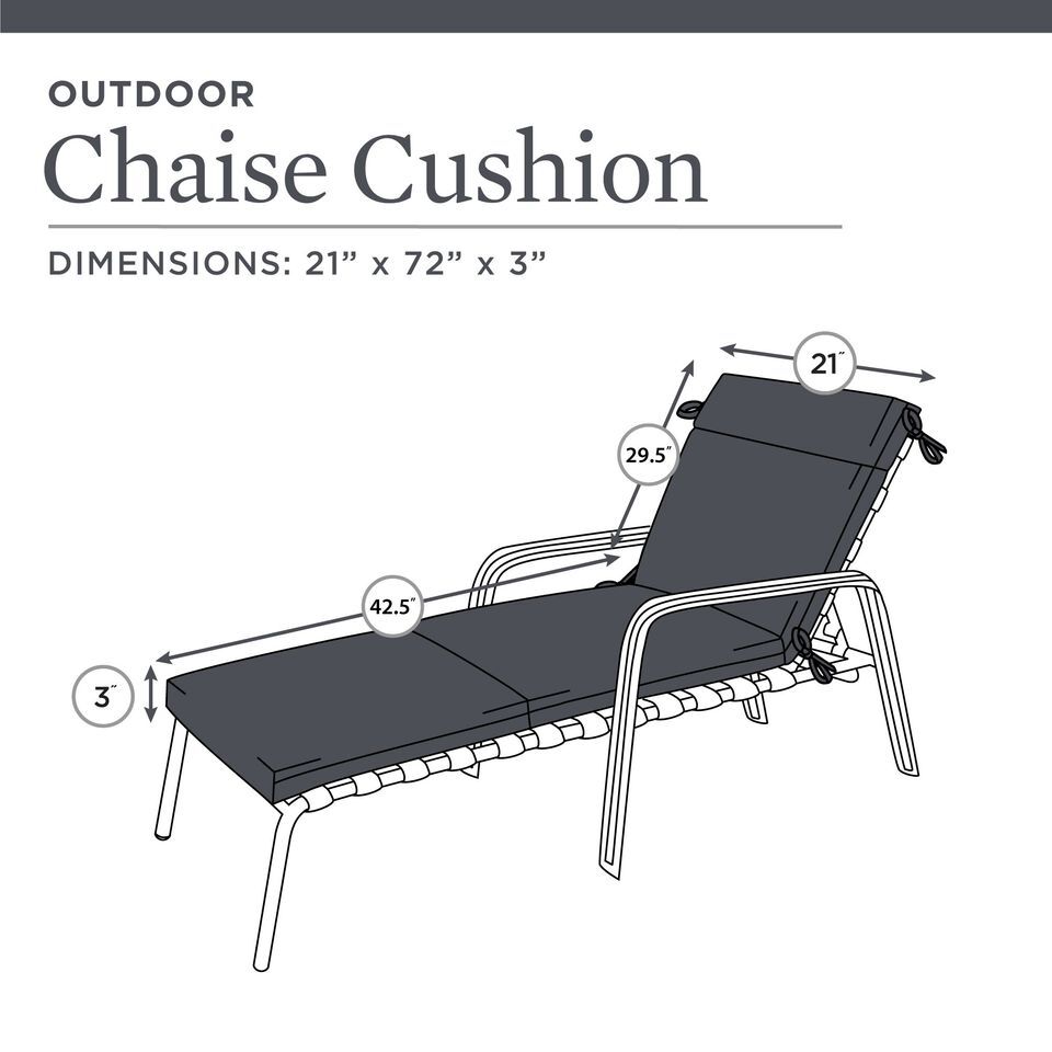 Total length includes 42.5" for the seat and 29.5" for the seat back Self ties to fasten cushion Fits most standard outdoor patio chaise lounges Enviroguard-treated, durable, 100 percent outdoor polyester fabric that protects from common outdoor stains UV-treated to resist fading Featuring new polysoft fabric with soft hand feel Protective treatment helps repel water 3 Year Limited Fabric Warranty Filled with everluxe poly, the latest in fiber technology which provides long-lasting comfort Intended for use on your patio or deck, however we recommend bringing it indoors when it rains or when not in use to preserve its lifespan Cleans easily with soap and water Coordinating items available