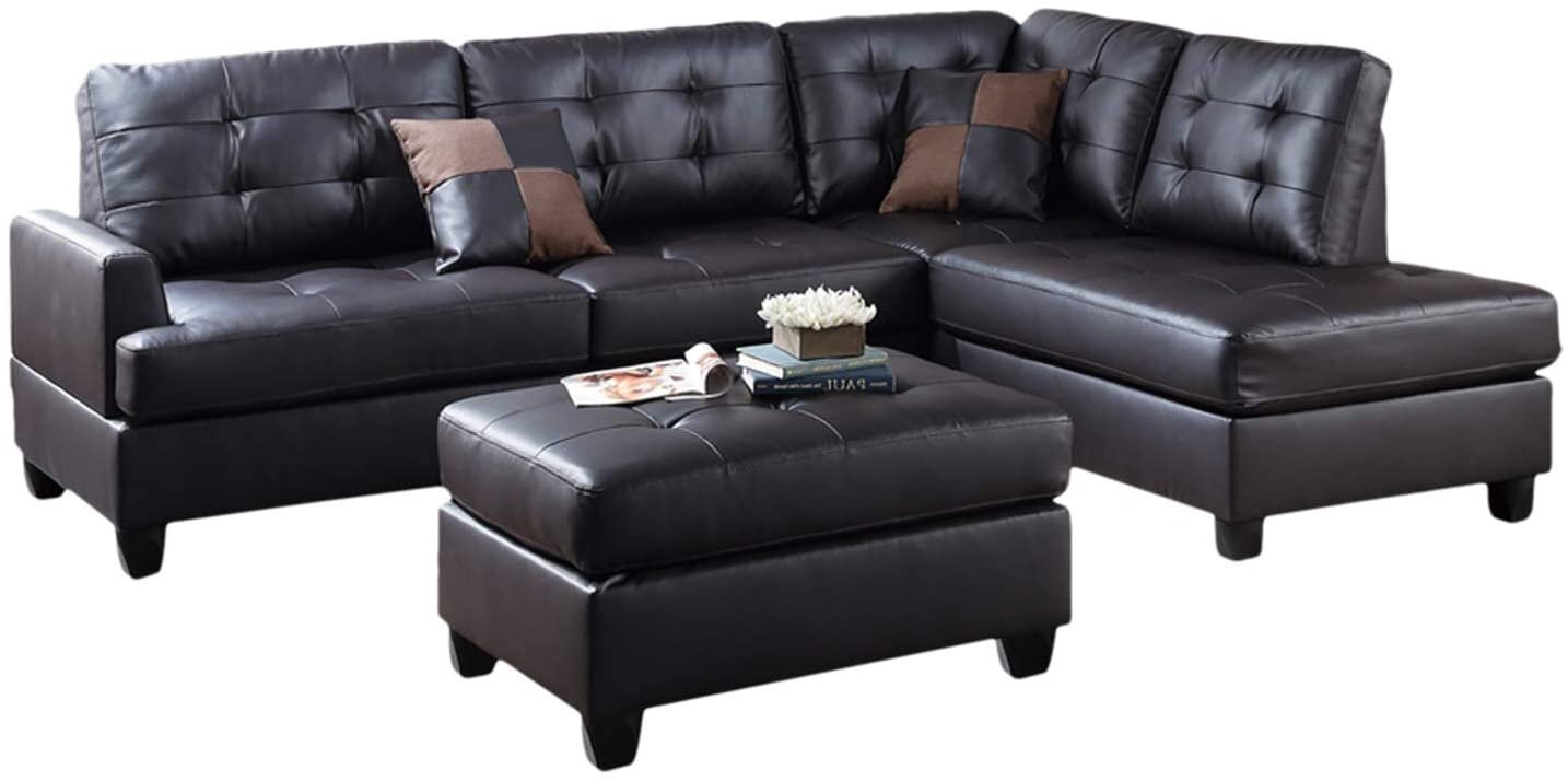 Sit back and enjoy the comfort of this modern 3-piece espresso-colored leatherette sectional from Venetian Worldwide. The set features a reversible chaise that faces either right or left as well as cushions with accent tufting. A matching cocktail ottoman and two stylish accent pillows are included. This set is also available in chocolate and gray microfiber.
