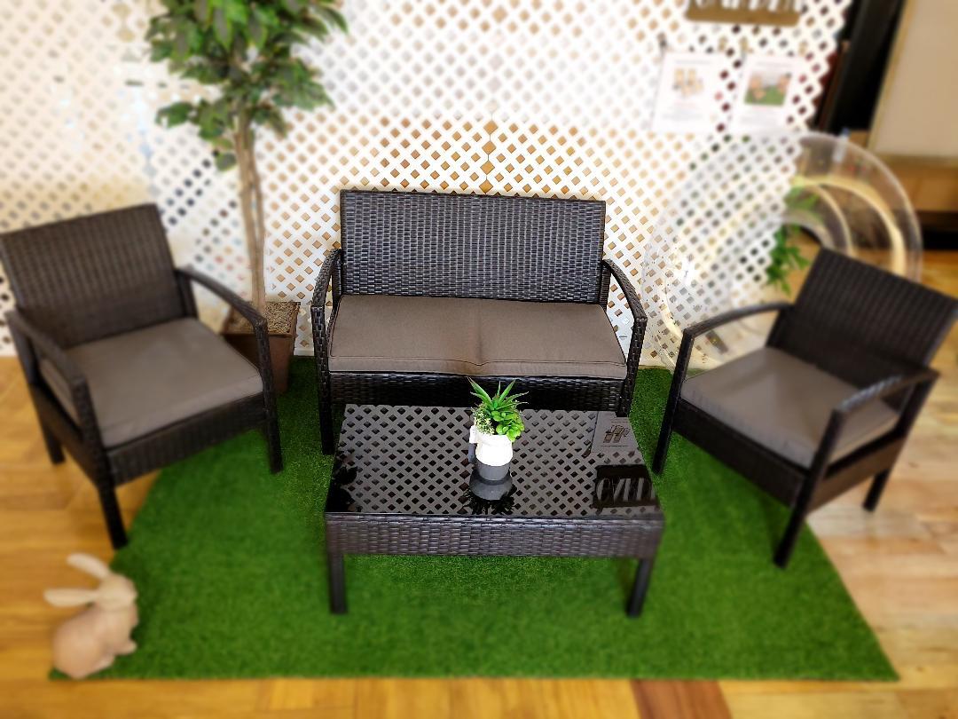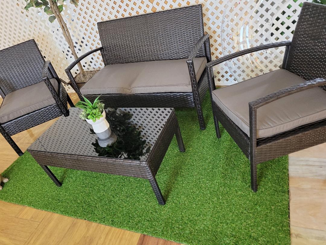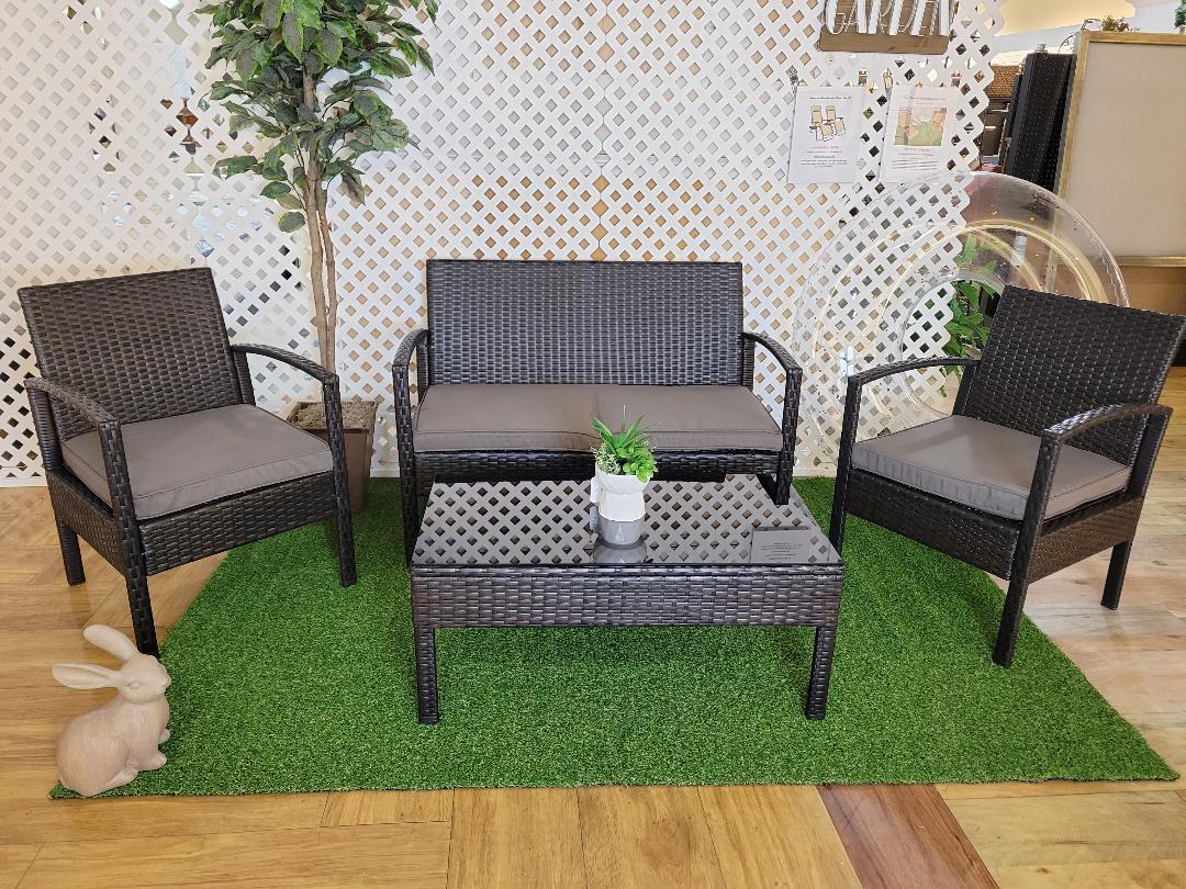 ~ Our Featured 4 piece wicker patio set. Includes loveseat, 2 single seats, elegant black glass coffee table, and cushions.
