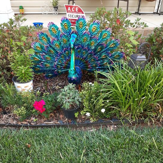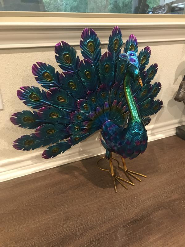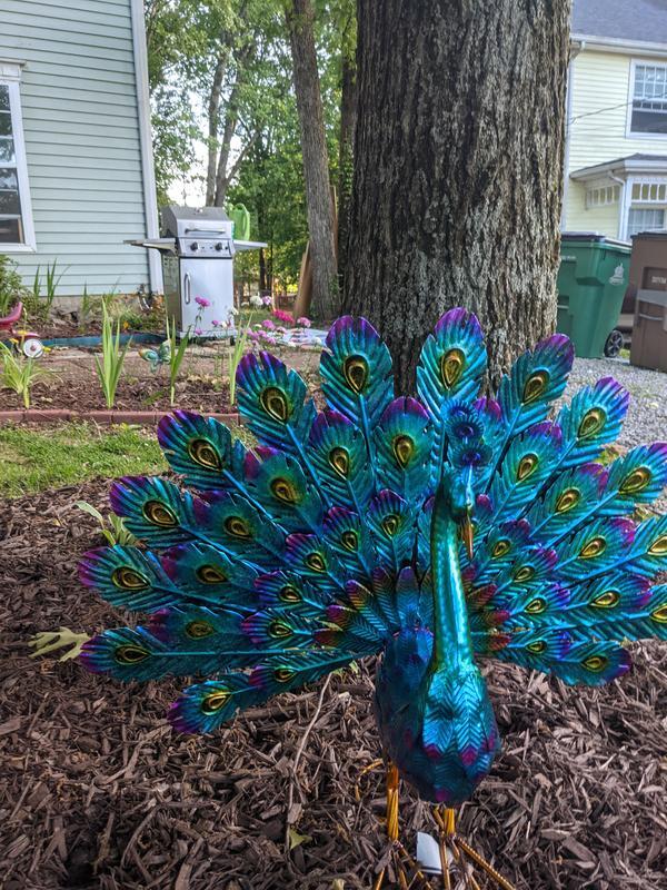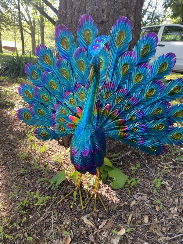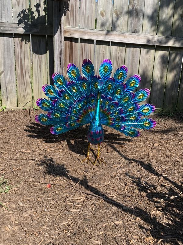 Add vibrant color into your beautiful garden and yard with this 23 in. Outdoor Metallic Peacock Tail Spread Yard Statue Decoration from Alpine. The garden decor features a self-standing peacock statue with beautiful texture that makes an original statement piece, while bringing a warm, inviting welcome to your front yard or entryway. Constructed from durable 100% metal, the yard decoration is sturdy and stable for years of quality use on your lawn or porch. The outdoor statue features intricate, real look embossed details on the sculpture, and electrifying colors add a bold statement to your patio or garden. Add one or multiple statues to create an enchanted garden display. Revamp your landscaping with this vibrant colored peacock statue. The statue is also perfect for display on your deck, or as an accent piece in your home's living room or den. The outdoor statue measures 32 in. L x 12 in. W x 23 in. H to fit almost any indoor or outdoor space, and includes a 1-year manufacturer's warranty from date of purchase.