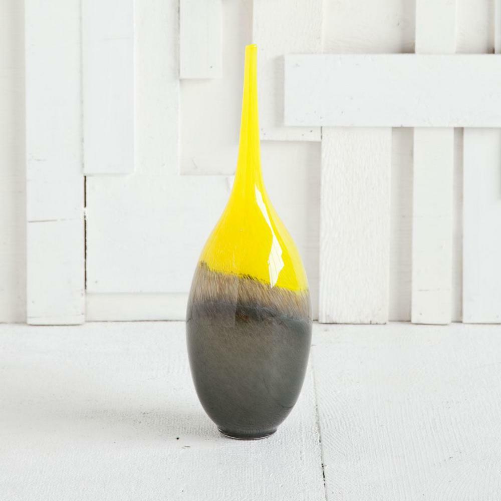 Jasse is a stunning hand-blown ombre yellow and gray glass vase. It's an elegant piece. It looks great in any room.