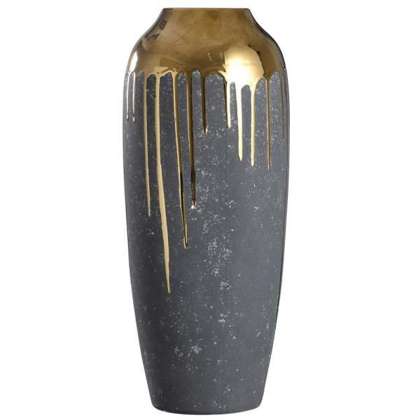 The Marloe Gold vase features a stunning reflective gold drip-accent finish on a charcoal varnished background. Its elegant oval silhouette has a tapered opening and pairs beautifully with any modern dcor. Place it on any tabletop, counter, or bookcase shelf to showcase its alluring details.